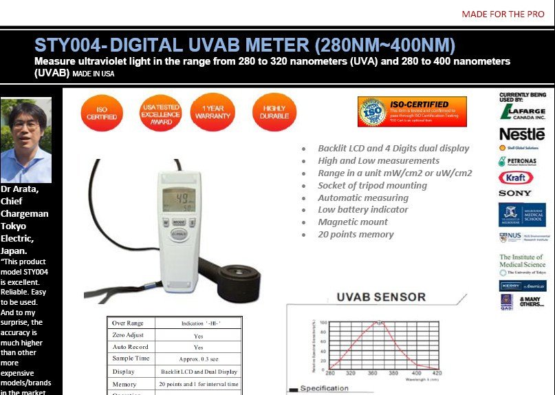 These instruments are designed to measure ultraviolet light in the range from 220 to 275 nanometers (UVC), 380 to 320 nanometers (UVA) and 280 to 400 nanometers (UVAB). The good illumination range of each kind of meter allow users to conduct the most precise quantitative measurements of ultraviolet radiation.